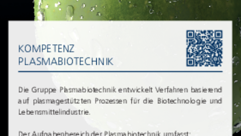 Die Abteilung Plasmabiotechnik bündelt die Kompetenzen in der Verfahrensentwicklung von Prozessen, die auf der Wechselwirkung von Plasma mit biologischem Material beruhen. Hierzu werden Kompetenzen sowohl in der Entwicklung, Abstimmung und Diagnostik von auf die Aufgabenstellung hin optimierten Plasmaquellen, als auch in der Diagnostik des behandelten biologischen Systems vorgehalten. Darüber hinaus stellt die Ableitung und Optimierung der erforderlichen Verfahrensentwicklung einen weiteren Schwerpunkt dar.