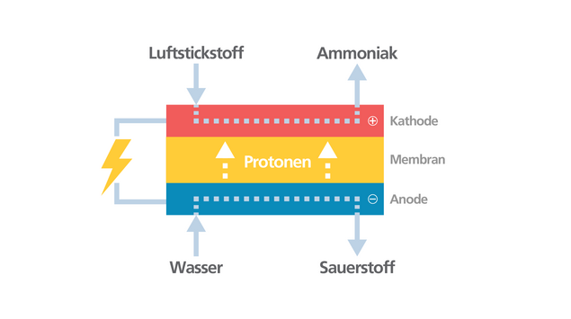 Schematische Darstellung der Festkörper -Ammoniaksynthese aus Luftstickstoff und Wasser auf der Basis von keramischen protonenleitenden Membranen (SSAS)