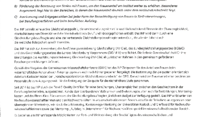 Das INP fokussiert eine paritätische Stellenbesetzung auf allen Qualifikations- und Beschäftigungsstufen und achtet daher besonders auf gendergerechte Personal-Besetzungsverfahren. So werden Frauen im Sinne der Gleichstellung bei gleicher Leistung, Eignung und Befähigung in den Bereichen bevorzugt eingestellt, in denen sie unterrepräsentiert sind. Auch intern unterstützt das INP seine Mitarbeiterinnen gezielt: Etwa mit Mentorings oder Fortbildungen. Hierfür steht ein extra Budget zur Verfügung, sodass Mitarbeiterinnen bestmöglich gefördert werden können. Zudem hat das Institut ein Eltern-Kind-Büro eingerichtet, um Eltern die Balance zwischen Familie und Arbeitswelt zu erleichtern. Bei Engpässen in der Betreuung können Mitarbeitende dort – mit Kind – arbeiten.