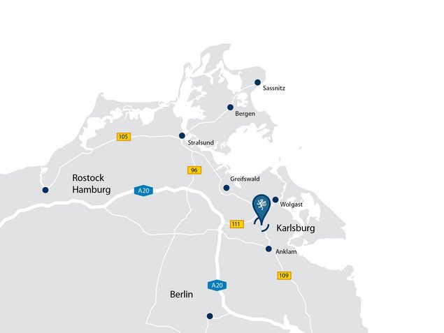 Von Berlin kommend folgen Sie bitte der A20 in Richtung Lübeck/Stralsund bis zur Ausfahrt 27 - Gützkow. Von dort gelangen Sie über die L35 bis in unsere Universitäts- und Hansestadt.